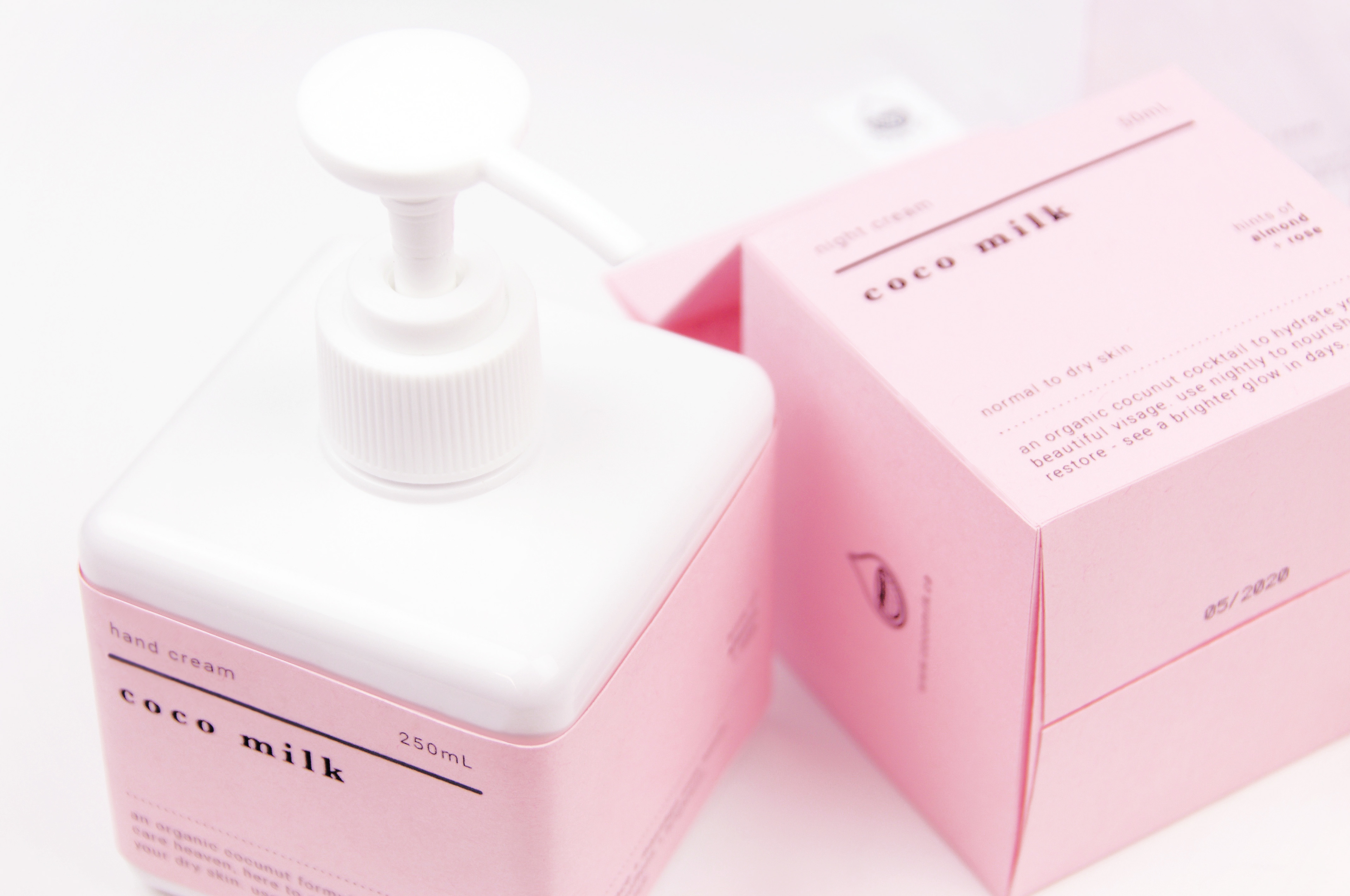 Cocomilk, a skin care product line that harnesses the nourishing power of coconut to hydrate and refresh all skin types. A clean and minimalistic design effortlessly conveys a chic and sophisticated brand. Pink is the only brand colour, representing rose—a main ingredient in the product line.